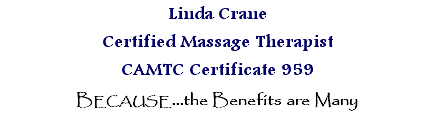 | Massage Therapy by Linda Crane, CAMTC Certificate 959, Certified Massage Therapist |